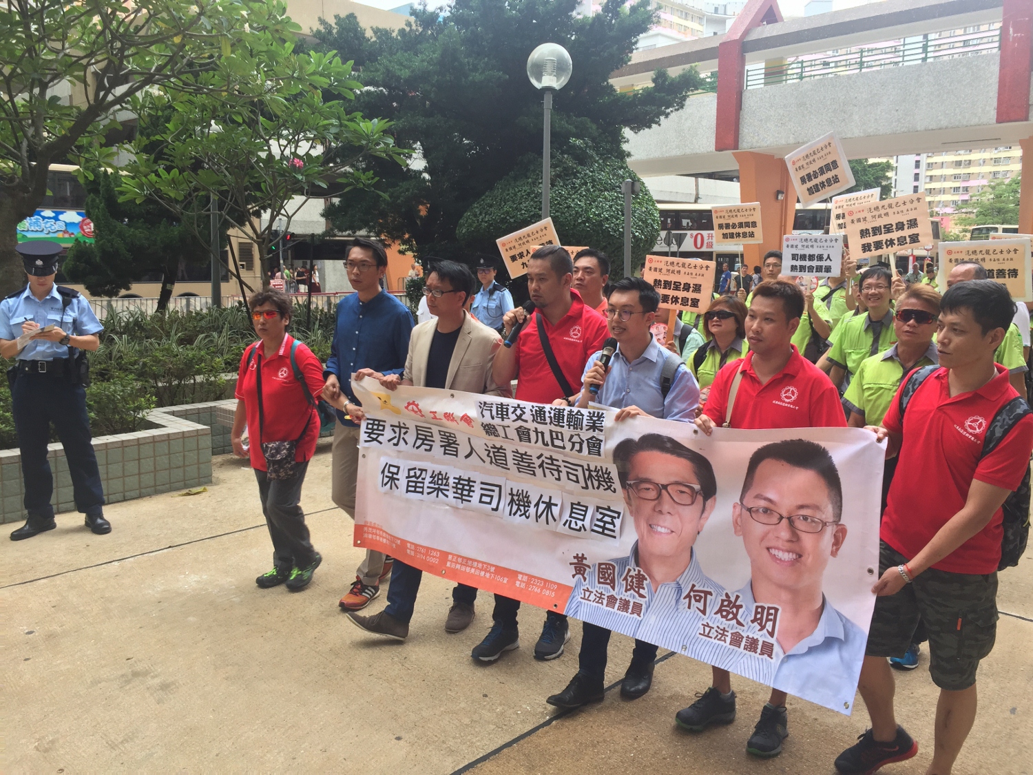 汽車交通運輸業總工會九巴分會聯同工聯會立法會議員何啟明、陸頌雄及勞工顧問委員會委員鄧家彪,8月11日於觀塘樂華邨巴士總站發起靜坐行動,強烈不滿房屋署四年來對於九巴車長對休息室的需求完全無動於衷, 罔顧巴士司機的休息及行車安全問題。