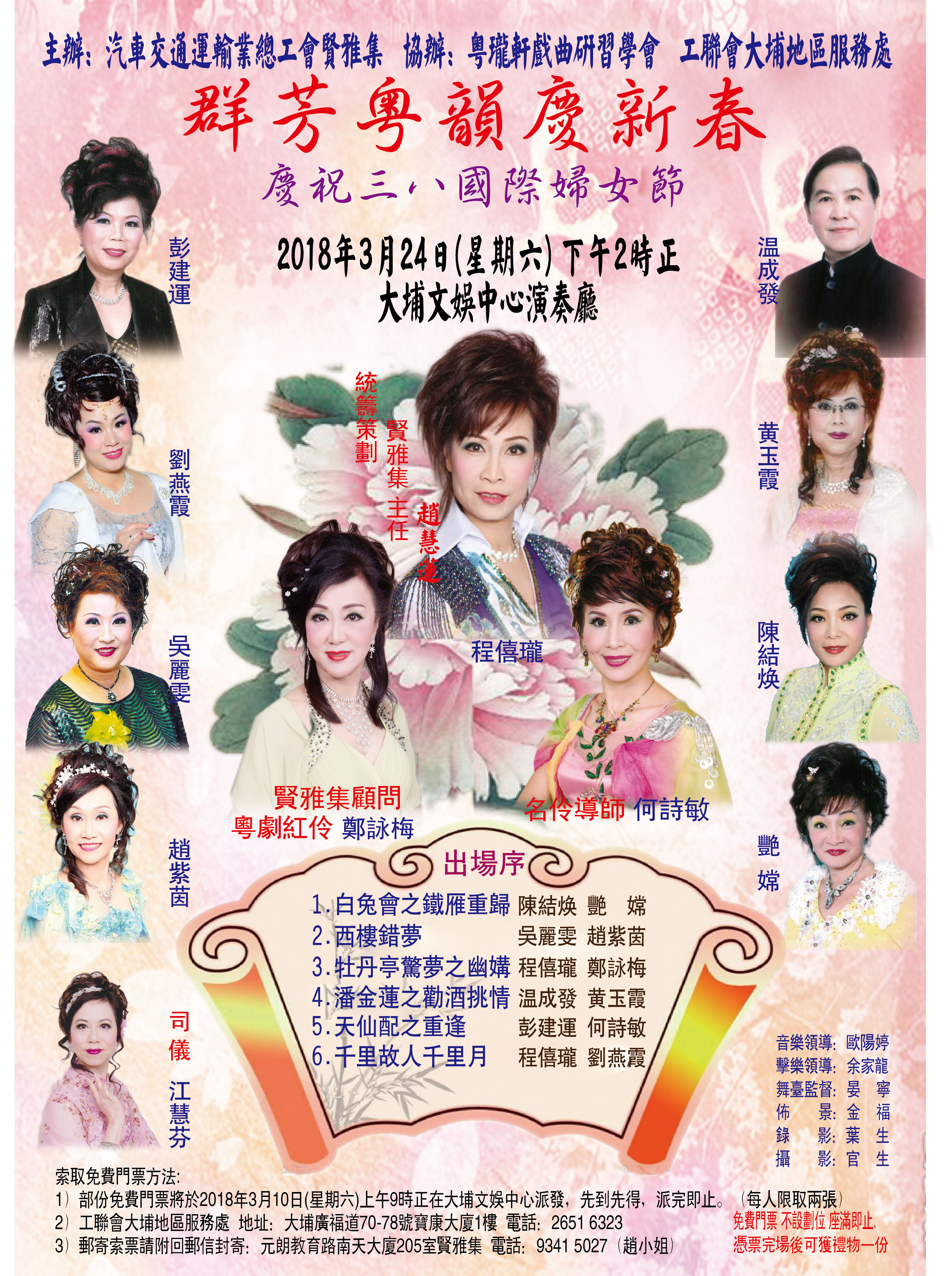 2018年「慶祝三八國際婦女節」粵曲欣賞會, 將於3月24日假大埔文娛中心舉行, 歡迎會員家屬, 知音友好支持, 憑票免費入場。